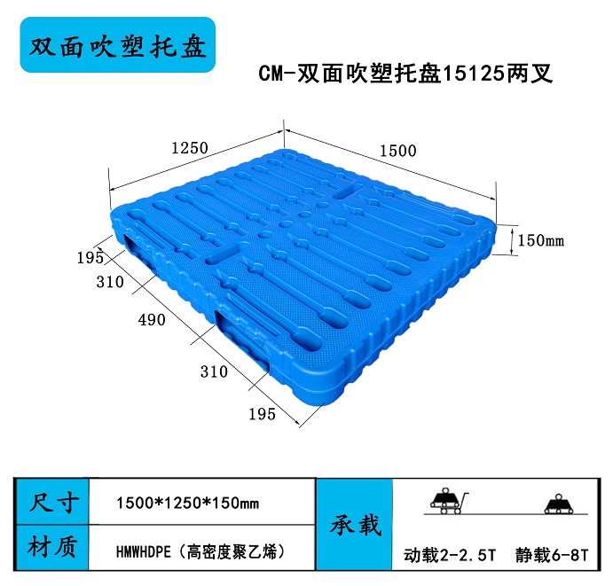 中空吹塑塑料托盤的生產(chǎn)與一般的中空制品吹塑成型方法相類似,因其產(chǎn)品較大,且為雙面型,需要較大的擠出機(jī)、合模機(jī)及模具等。目前國內(nèi)中空成型機(jī)制造廠家已經(jīng)研發(fā)出專業(yè)高速生產(chǎn)高強(qiáng)度吹塑托盤的超大型中空成型機(jī),采用HDPE(低壓高密度聚乙烯)高強(qiáng)度塑料生產(chǎn),成型速度較快,產(chǎn)品質(zhì)量較好,具有高強(qiáng)度、壽命長的特點(diǎn),一般吹塑托盤的使用壽命可以達(dá)到5~10年,同時(shí)可以在-40~70℃的環(huán)境下穩(wěn)定工作。其產(chǎn)品的動(dòng)載可以達(dá)到3t以上,抗彎強(qiáng)度均是較高的水平。是高強(qiáng)度使用環(huán)境的首選托盤,目前其價(jià)格比注塑托盤偏高一些,但其使用壽命特別長,所以它的性價(jià)比是所有托盤中最高的。吹塑托盤隨著成型設(shè)備價(jià)格的大幅度降低,將會(huì)在近年內(nèi)獲得較快的發(fā)展。將對(duì)于節(jié)約有限的石油資源與物流成本有極大的好處。